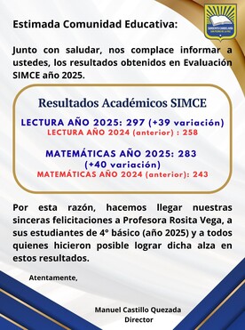 Nuestro sincero reconocimiento a Docentes, asistentes y principalmente a nuestros queridos estudiantes por la significativa alza que experimentaron en los resultados obtenidos en Evaluación SIMCE año 2025.